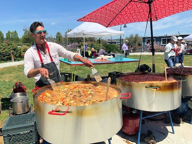 Event coordinator Pete Hudson reported that Davey Jones’ paella (4 varieties) was a smash: “I bought 200 compostable single–use food serving bowls and 200 compostable spoons and all were used,” he told the Floating Times. “Assume some had two servings, so say 175 people ate paella.”