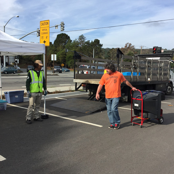 Our first e-waste collection event, on October 22, was a big success. 40 participants dropped off 1338 lb of electronic waste: TVs and computers, old phones and discarded cables. While some people arrived by car, others lugged their e-waste over to the WPH parking lot using shopping carts and trolleys, and still others walked over carrying tote bags bulging with items to discard. The central location, at the corner of Bridgeway and Gate 6 Road, worked well for both the floating home community and for Sausalito residents.