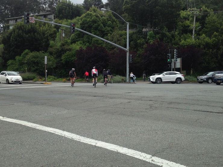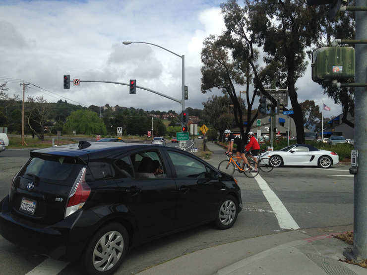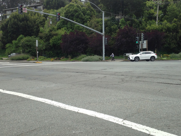 Why is this important? The intersection is unsafe, as Issaquah resident Mickey Allison knows. “Returning from Marin City by bicycle about five years ago, the pedestrian light came on, and a car didn’t stop. Fortunately, I hadn’t moved forward so only my front wheel was hit by the car, knocking my old bike out of my hands,” says Mickey, a frequent Marin City Library patron. “Now, if I’m walking, pushing my granddaughter in her stroller, or biking, I wear bright colors and wave my arms to get the attention of drivers turning right.” She added, “Only if they acknowledge me do I feel safe enough to cross.”