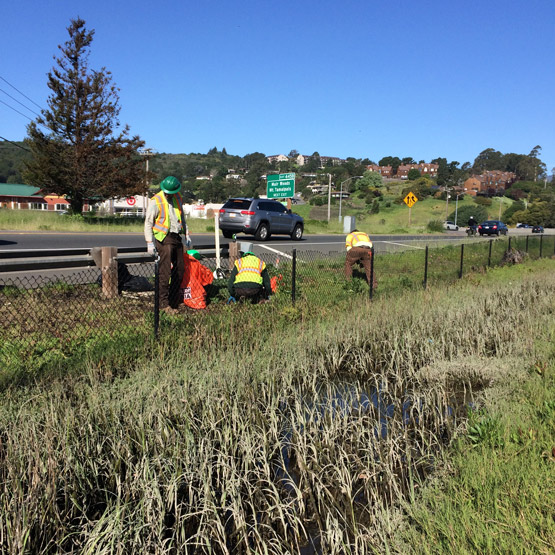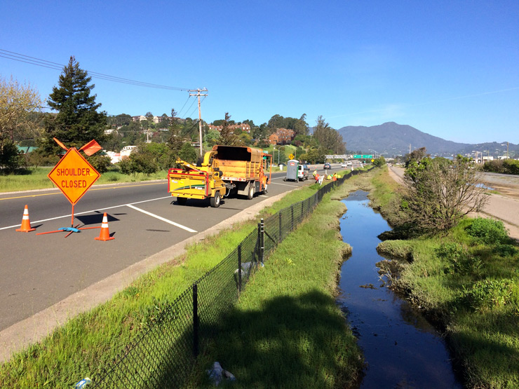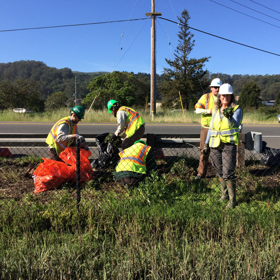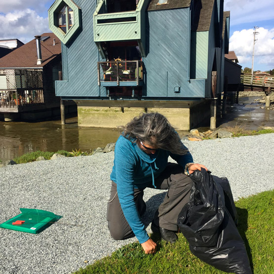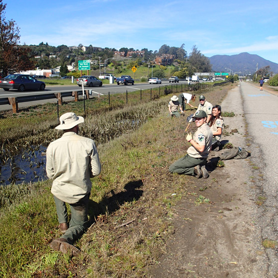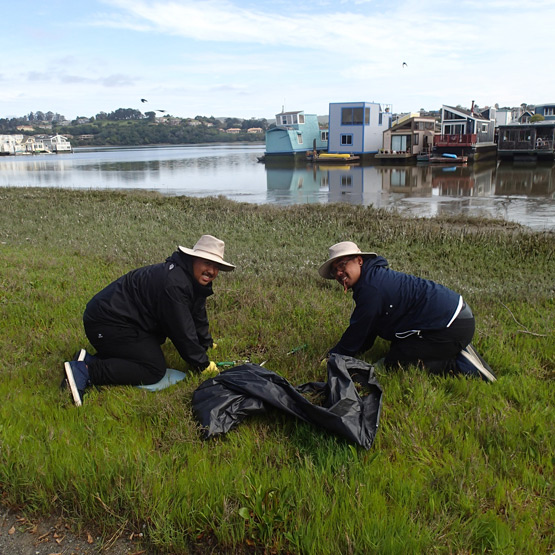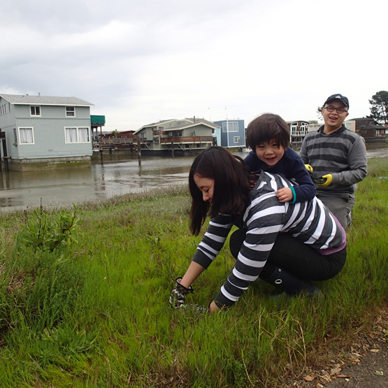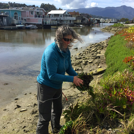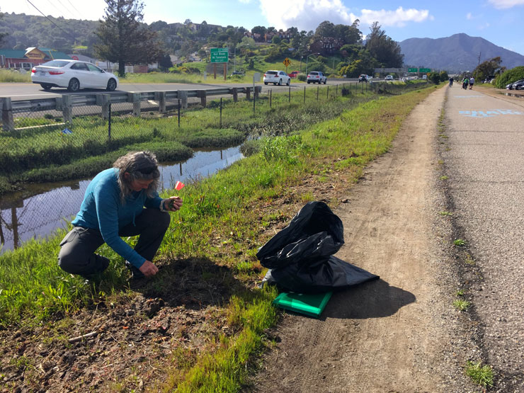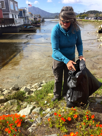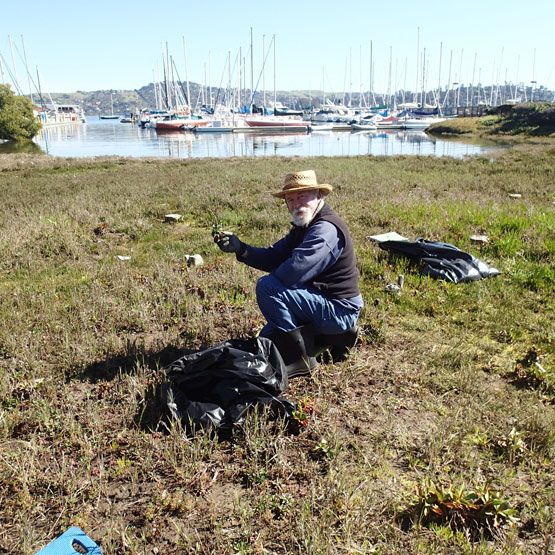 You don’t need to know plant Latin to help out. For the past few years, Jude (pronounced Judy) Stalker has organized small bands of volunteers to help her tackle areas throughout Southern Marin, many of them situated around Richardson Bay. Several of the most recent work sessions have focussed on our own backyard: the stretches surrounding Kappas and leading out toward Gate 6 1/2 and the area flanking the bike path alongside Highway 101. Send Jude an email to receive advanced notice of where the next invasive species removal will occur. Work sessions for volunteers run Sundays from 10 a.m. to 1 p.m. (with a break on April 16 for Easter)—typically anywhere from three to eight people show up.