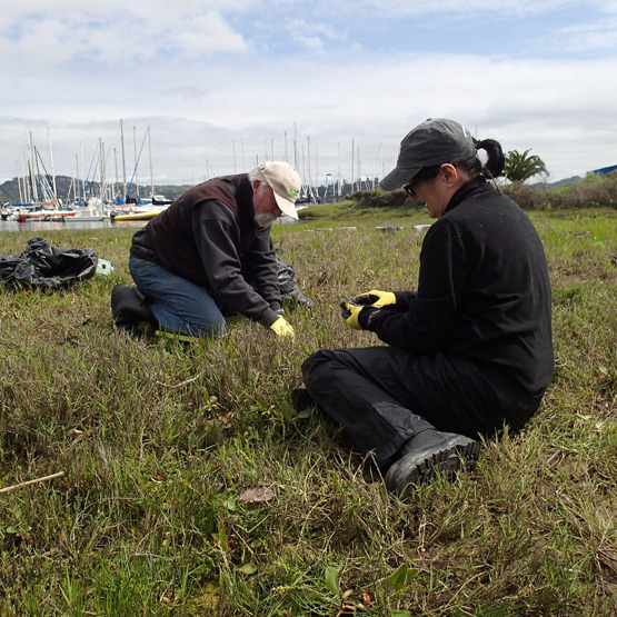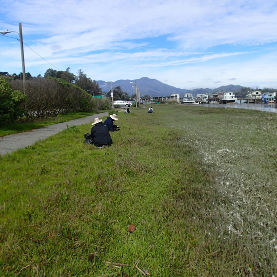 In 2011 Marin Audubon formed a partnership with the Bay Area Early Detection Network and we got volunteers to come and remove it from the locations where LIRA had been spotted. They never got all of it. Kathy Boyer, the professor of Biology (Wetland Ecology) at SFSU, who found the European sea lavender up at Strawberry Marsh, would bring her students out to remove it once a year. Over the years we’ve gotten it at certain sites; we’ve never gotten it at all the sites and we’ve never gotten all of it out, mainly due to my own time restraints (or limits). Even though I’m doing the work for and with the Marin Audubon—it is my passion—I’m volunteering my time. [researching parcels, requesting permission, coordinating work crews, working alongside volunteers]