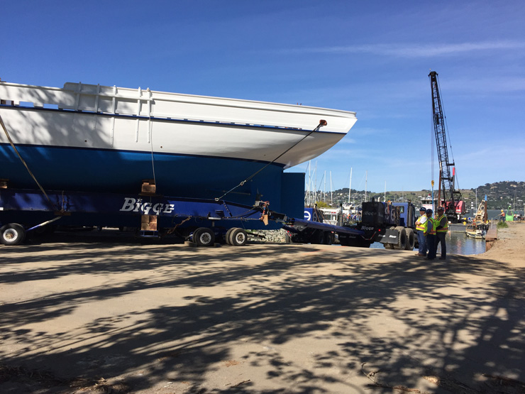 The ship, modeled after the famous brigantine Galilee, which was designed and built by Matthew Turner 124 years ago, was wheeled out of her tent on Friday, and positioned on the Army Corps of Engineers concrete ramp. On Saturday, after a few false starts, she slipped into the water with bunting snapping in the Bay breeze, to the delight of hundreds of spectators on shore and on the water in every type of watercraft imaginable. Then she was towed to her new home alongside the Corp of Engineers dock. There she’ll stay while her masts, rigging, cabin and deck houses are installed.