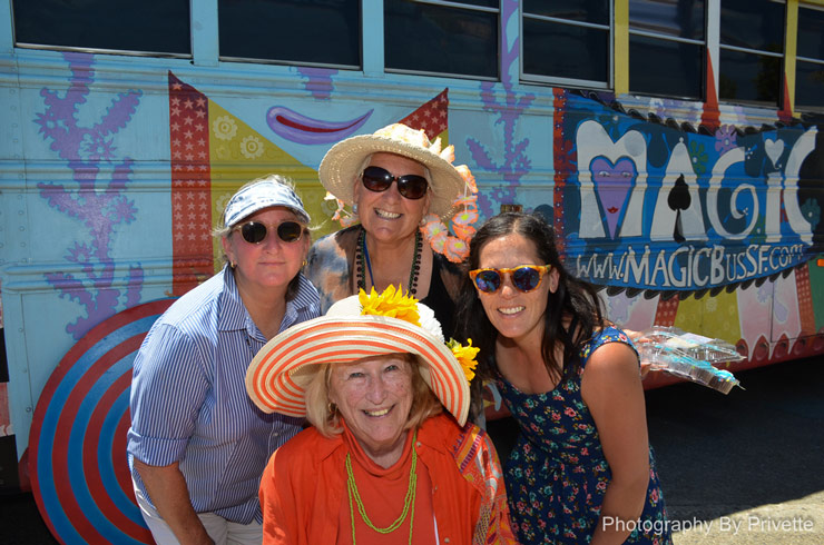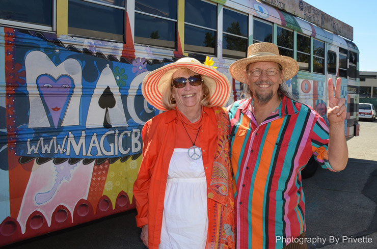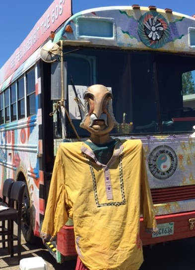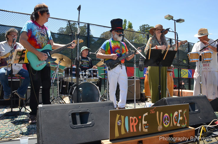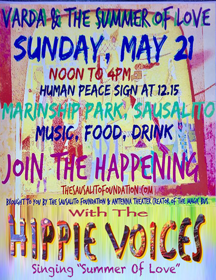 Joe Tate—who has been playing music on the Sausalito waterfront since the Summer of Love—played a set with his current band, The Hippie Voices. Antenna Theater, co-sponsor of the event, displayed its Magic Bus and 1960s paraphernalia, along with a life-size puppet of Varda. Local artists were on hand with displays of their work for sale.