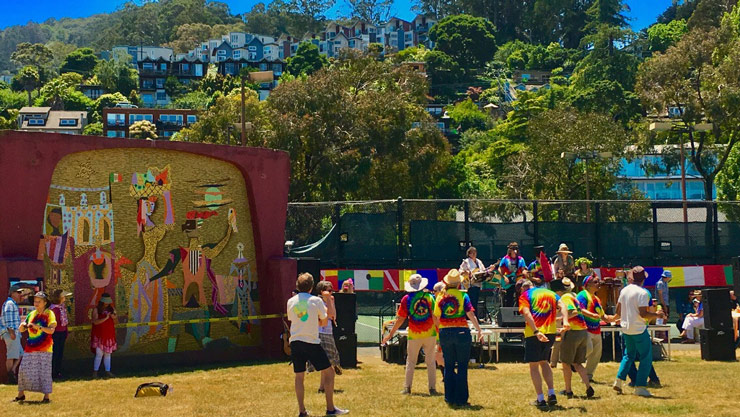 The famed Sausalito artist Jean Varda would have been right at home in Marinship Park last Sunday, as he and the Summer of Love were both celebrated with music of the ‘60s, dancing in the sunshine, art, libations, and a huge human peace sign. The good times rolled as The Sausalito Foundation launched their campaign to restore the splendid Varda mosaic that anchors the southwest corner of the park.