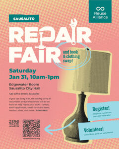 Reuse Alliance will be hosting a Repair Fair in the Edgewater Room at Sausalito City Hall from 10:00 a.m. to 1:00 p.m. on Saturday, January 31. Community members are welcome to bring in their broken items and meet with a volunteer repair coach who will then fix the item while providing tips along the way. This free event will also feature a clothing and book swap in partnership with Phoenix Used Bookshop.