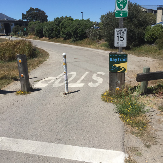 In the meantime, take note of the many other improvements we’ve initiated along the multiuse pathway, including most recently fresh striping and stencils. The County of Marin (DPW), Marin County Parks, and Marin County Sheriff’s Office), the City of Mill Valley and the Marin County Bicycle Coalition are collaborating to improve access and safety along the pathway. This collaborative effort includes the Share the Path campaign, which promotes safety, communication and friendliness; regulatory changes including an enlarged “slow zone” of 10 mph adjacent to Bayfront Park; and increased enforcement of safety rules and regulations.