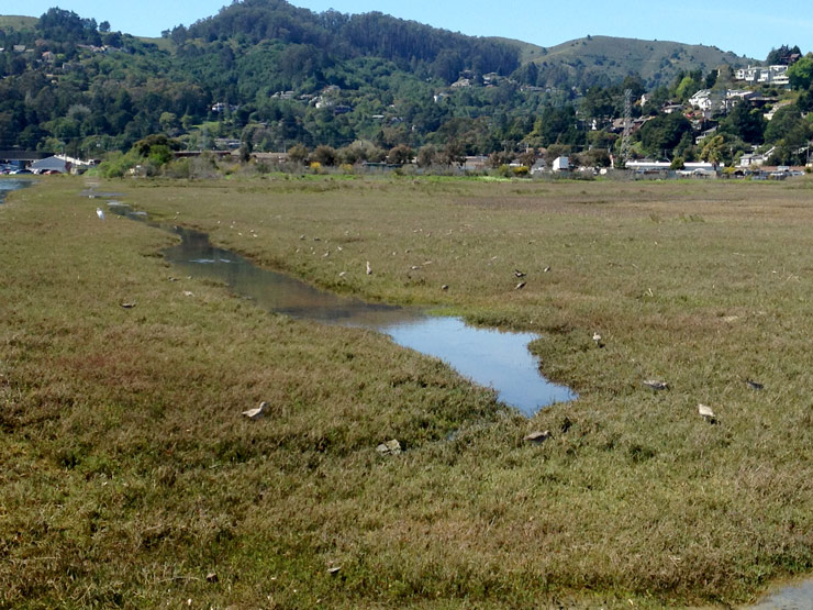 Marshes depend on mudflats. Richardson Bay has a steep escarpment separating it from San Francisco Bay. (This doesn’t stop the water — only the sediment.) Sediment feeds into Richardson Bay from Coyote Creek and Arroyo Corte Madera, from Tam Valley and Mount Tamalpais. Right now, the marshes on either side of the multi-use path are unhealthy.