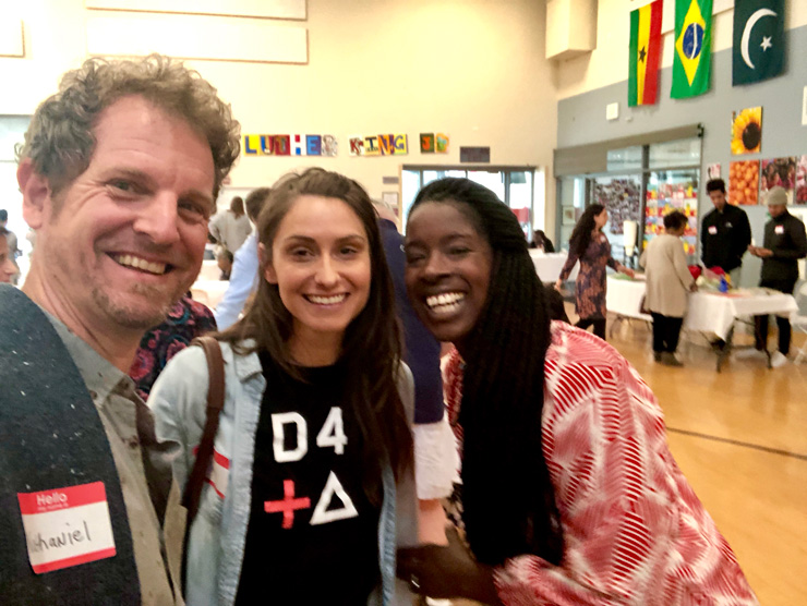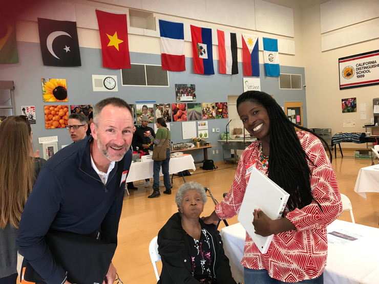 The author, Peter Teague, of South 40 and PT Philanthropic, with Pandora Thomas, lead for the P+SET Resilient by Design team (Permaculture plus Social Equity) and her mom, Anthea—education booths in background—at the May 5th Designing Our Own Solutions community event in Marin City  |  photo by Diana Cohn  |  post by Peter Teague