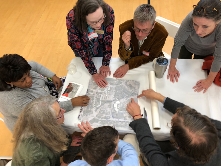 Terrie Green of Shore-Up Marin and County Commissioner Kate Sears, with Marin City community members and facilitators from the P+SET Resilient by Design team