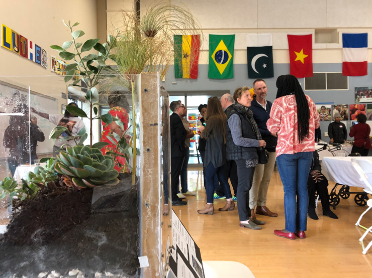 Community members and stakeholders discuss Marin City ecological challenges and solutions—section model at left of a vegetated infiltration terrace that shows permaculture principles (Diana Cohn of South 40, with Peter and Pandora)  |  these photos by Nathaniel Corum