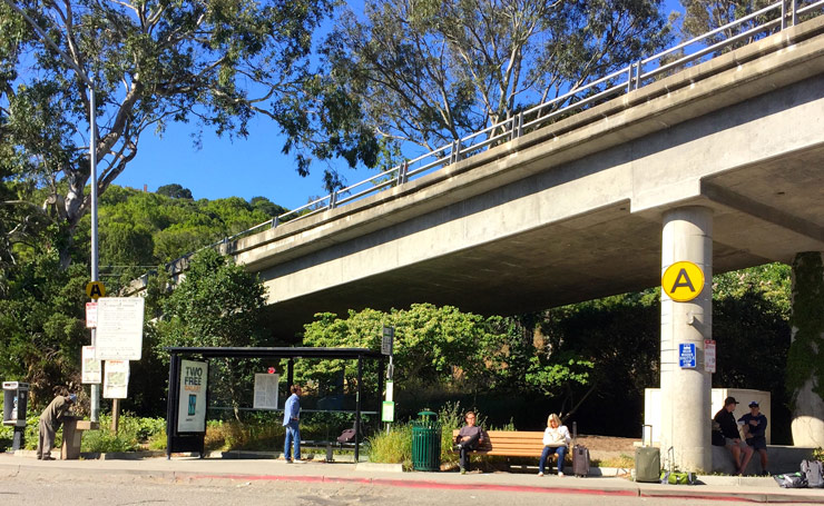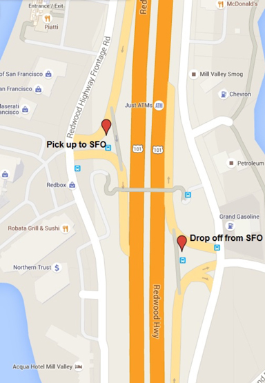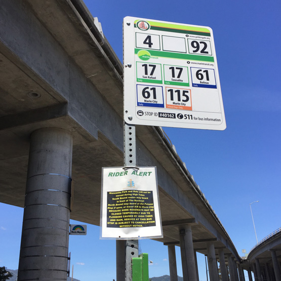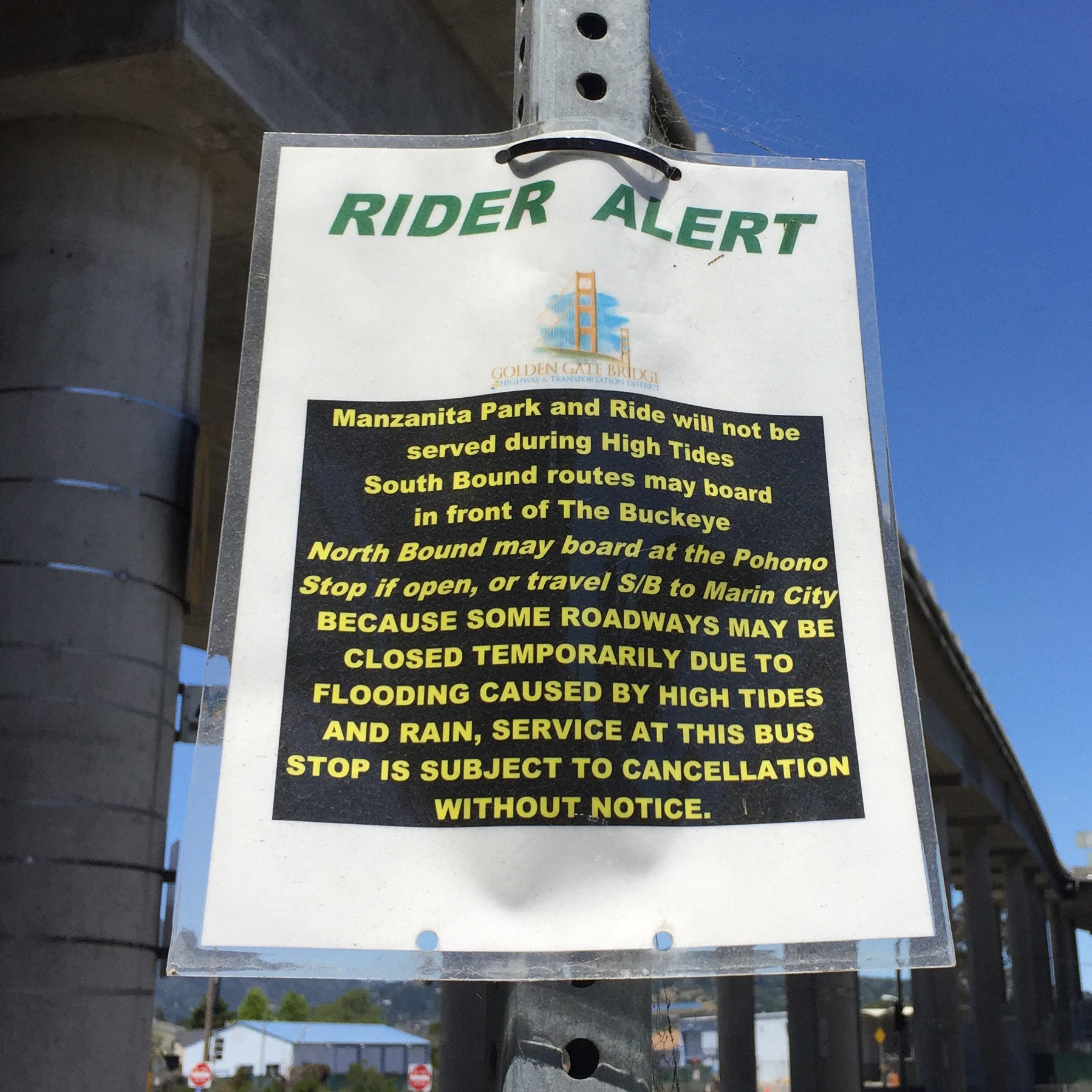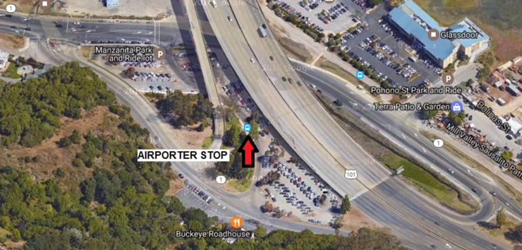 While Marin Transit has posted signs advising riders of their alternate pick up/drop off point (if SB over at the Buckeye Roadhouse, or NB at the Pomona lot, etc.), Marin Airporter bus drivers will continue to pick up and drop off until they encounter physical barriers (cones and such) put up by Caltrans. Know that Marin Airporter will not pick up or drop off at the Buckeye, or Pomona, but will simply drive on to the next pick up/drop off point. Either Seminary Drive or Spencer Ave, depending upon the direction of travel. Traveling in winter? Add an extra half-hour to accommodate this possibility.