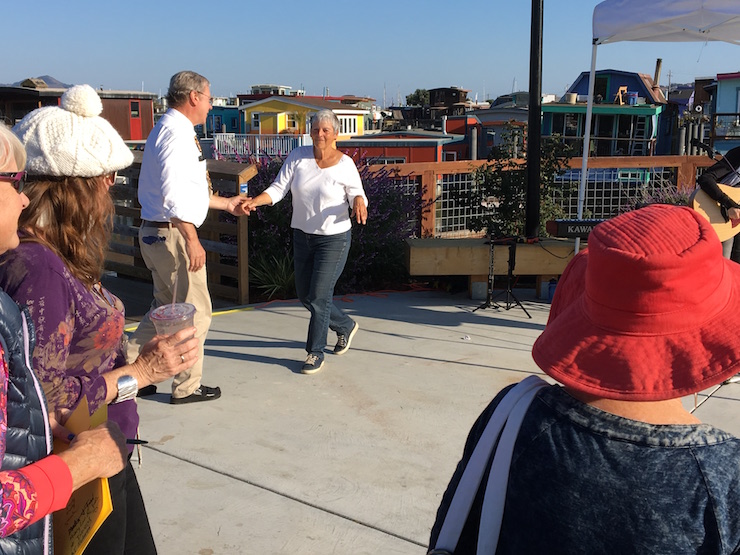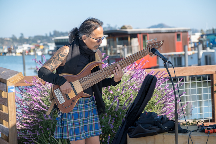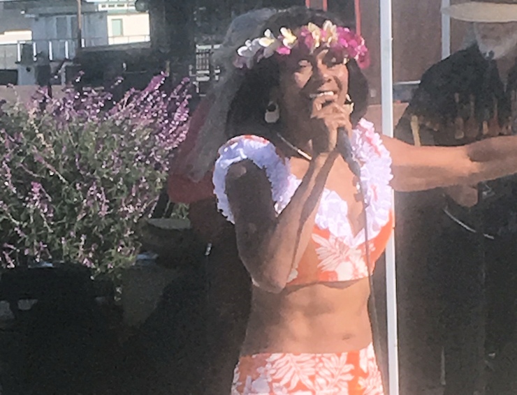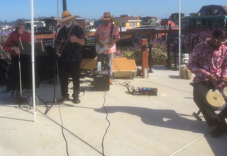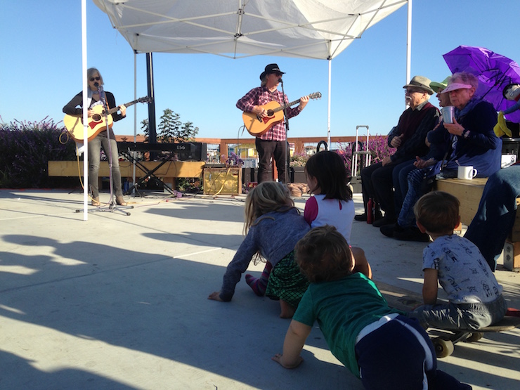 Joe Tate and his band of many, including Maggie Catfish, Pacifico Sumante, Rick Pruett on bongos, and Hawaiian dancer/singer Kilani Ka’anoi got the party started with an eclectic mix of folk and Hawaiian numbers. Edo Castro-Woodhouse evoked comparisons to Pat Metheny, and John Schlag joined him on keyboard for a few Edo-arranged tunes. Katy Boyd and Marty Atkinson got a few people dancing and the Van Damme Hot Clams (Davey Jones and Gavin Smith) serenaded the community as dusk fell.