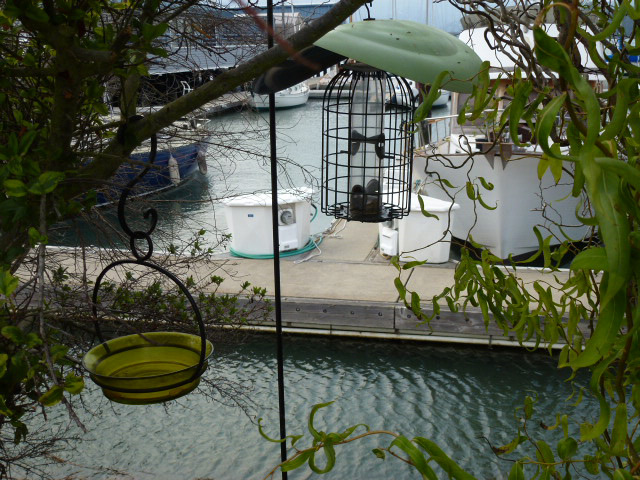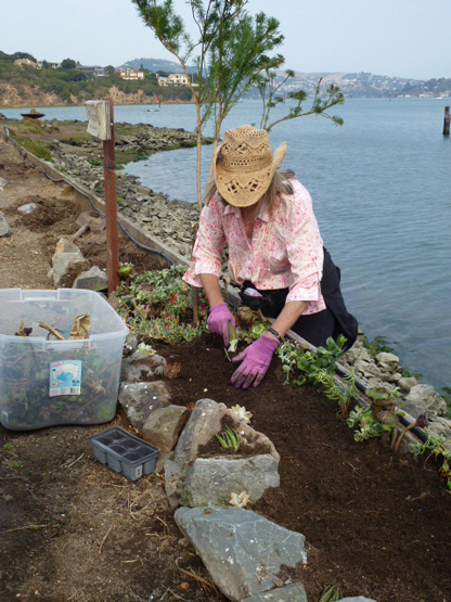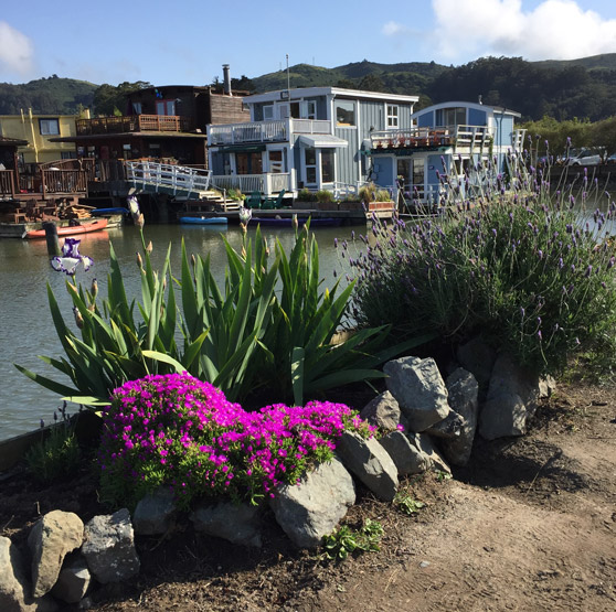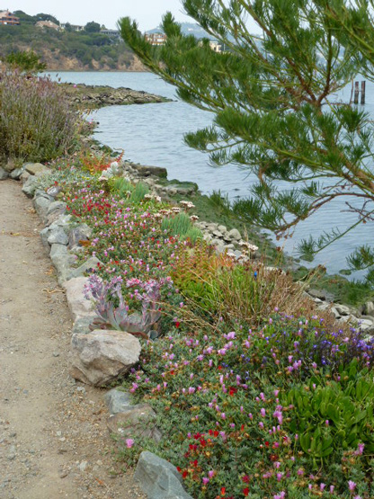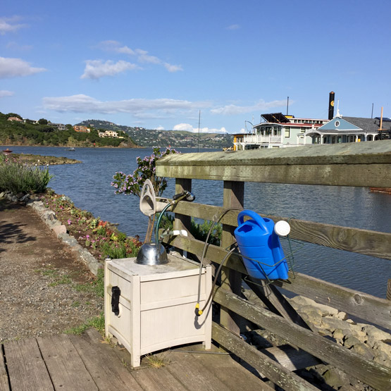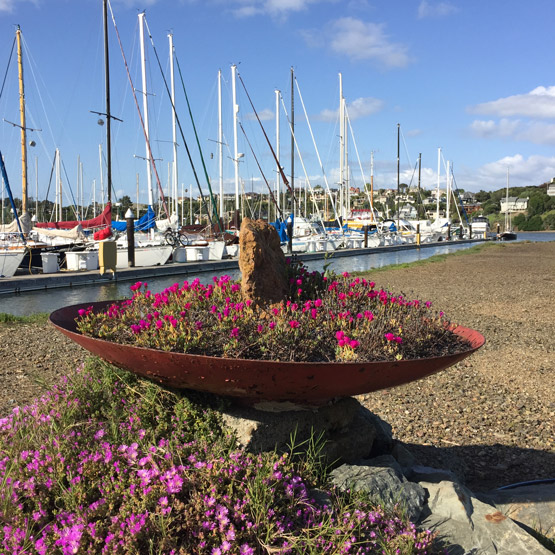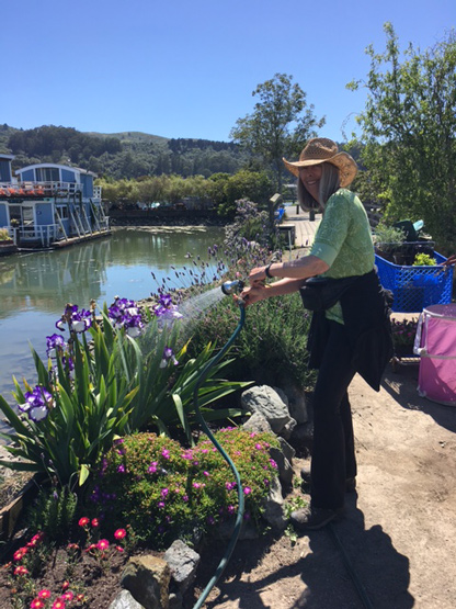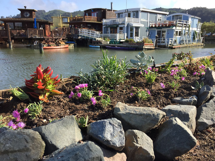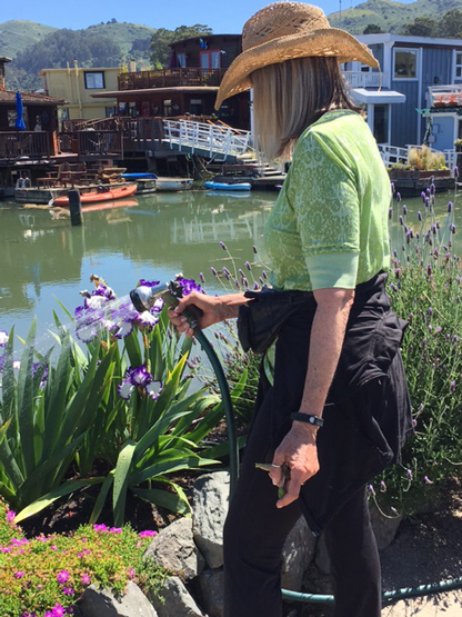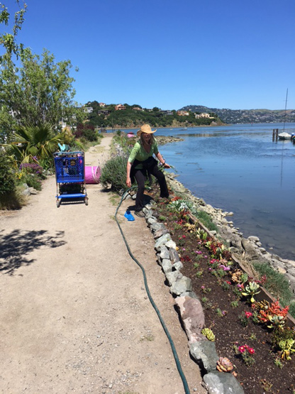Dogs have also always been a part of my family, and for years, the spit—jutting out between Yellow Ferry and the Richardson Bay Harbor Office—was where we walked our dogs. 16 years ago, the spit was, if you’ll excuse the expression, a giant litter box for dogs. But there was dirt, and it just seemed like a great place given my lack of terra firma. For the first 3 years there was no running water out there, so I had to “bucket” the water out. Consequently, my plants were pretty sparse. Then Chris Tellis—of Yellow Ferry—plumbed water out to the spit and the plants were ever so happy.
