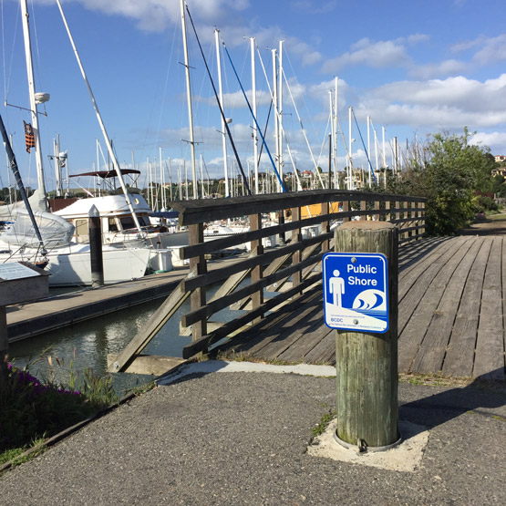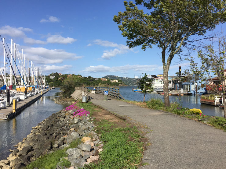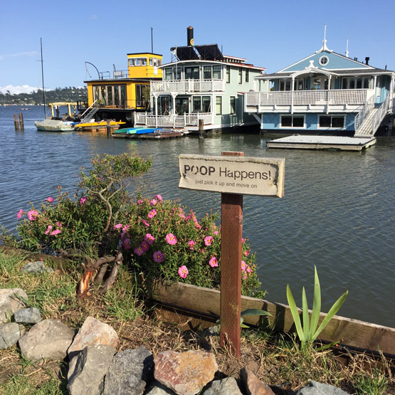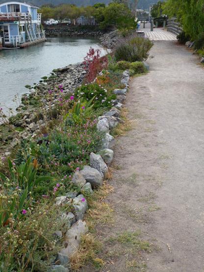 Chris also had a retaining wall built on the right (south) side of the spit. But over the years the rocks below the wall have been pulled away by the tides and the bank has eroded. My greatest frustration is the tide stealing the dirt from the plants. Waldo Point Harbor donated plastic bags and dispenser boxes with “pick up after your dogs” signs and my husband Jon (Sibaila) mounted the boxes where folks can see them. It was, and is, a great help in reminding folks to do just that: pick up.